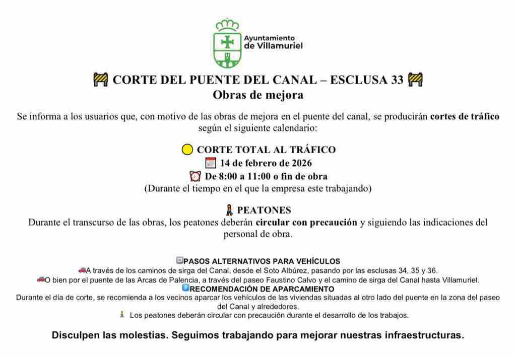 Obras de mejora Se informa a los usuarios que, con motivo de las obras de mejora en el puente del canal, se producirán cortes de tráfico según el siguiente calendario: 🟡 CORTE TOTAL AL TRÁFICO 📅 14 de febrero de 2026 ⏰ De 8:00 a 11:00 o fin de obra (Durante el tiempo en el que la empresa este trabajando) 🚶♂️ PEATONES Durante el transcurso de las obras, los peatones deberán circular con precaución y siguiendo las indicaciones del personal de obra. PASOS ALTERNATIVOS PARA VEHÍCULOS A través de los caminos de sirga del Canal, desde el Soto Albúrez, pasando por las esclusas 34, 35 y 36. O bien por el puente de las Arcas de Palencia, a través del paseo Faustino Calvo y el camino de sirga del Canal hasta Villamuriel. RECOMENDACIÓN DE APARCAMIENTO Durante el día de corte, se recomienda a los vecinos aparcar los vehículos de las viviendas situadas al otro lado del puente en la zona del paseo del Canal y alrededores. Los peatones deberán circular con precaución durante el desarrollo de los trabajos. Disculpen las molestias. Seguimos trabajando para mejorar nuestras infraestructuras.