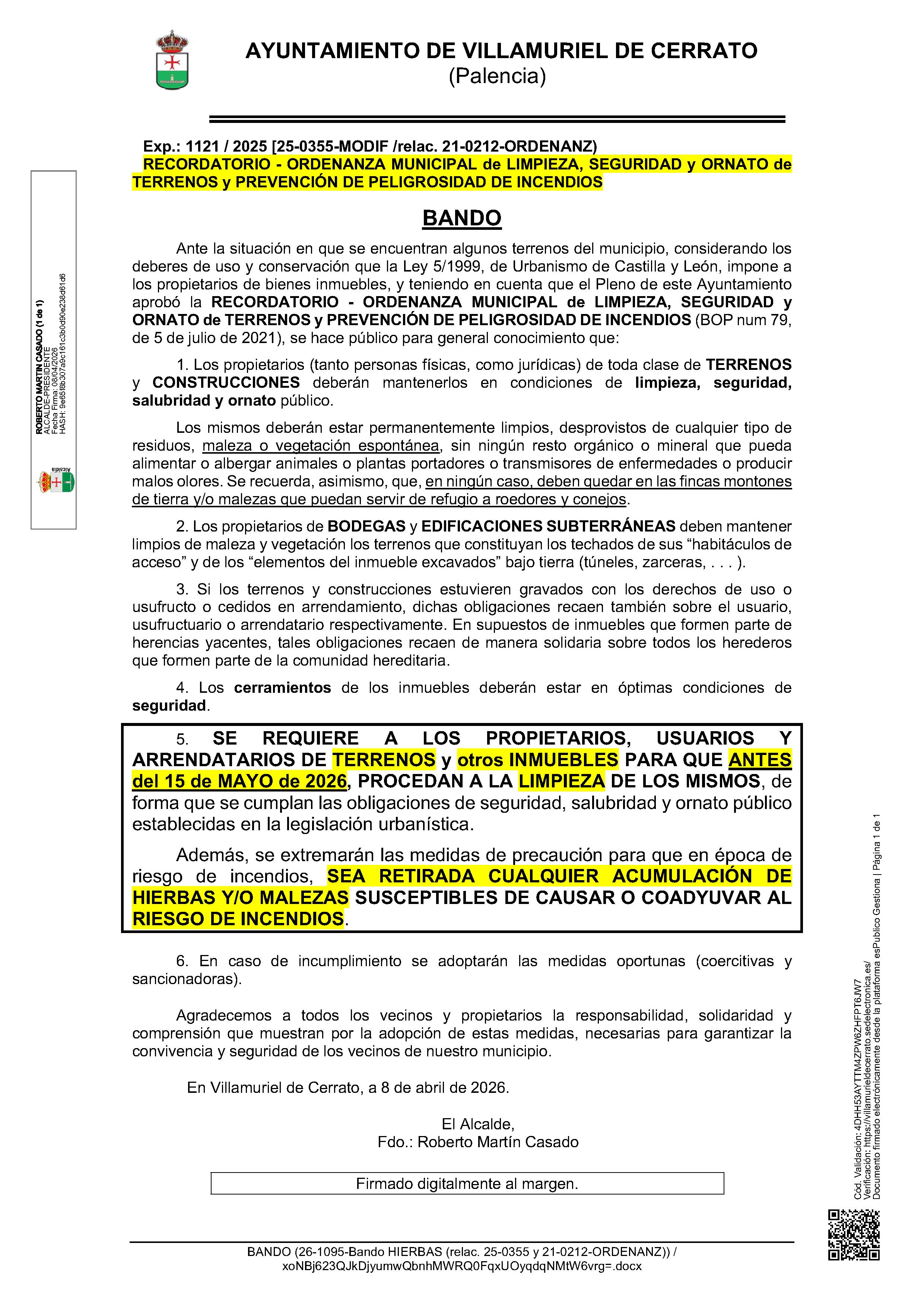 Ante la situación en que se encuentran algunos terrenos del municipio, considerando los deberes de uso y conservación que la Ley 5/1999, de Urbanismo de Castilla y León, impone a los propietarios de bienes inmuebles, y teniendo en cuenta que el Pleno de este Ayuntamiento aprobó la RECORDATORIO - ORDENANZA MUNICIPAL de LIMPIEZA, SEGURIDAD y